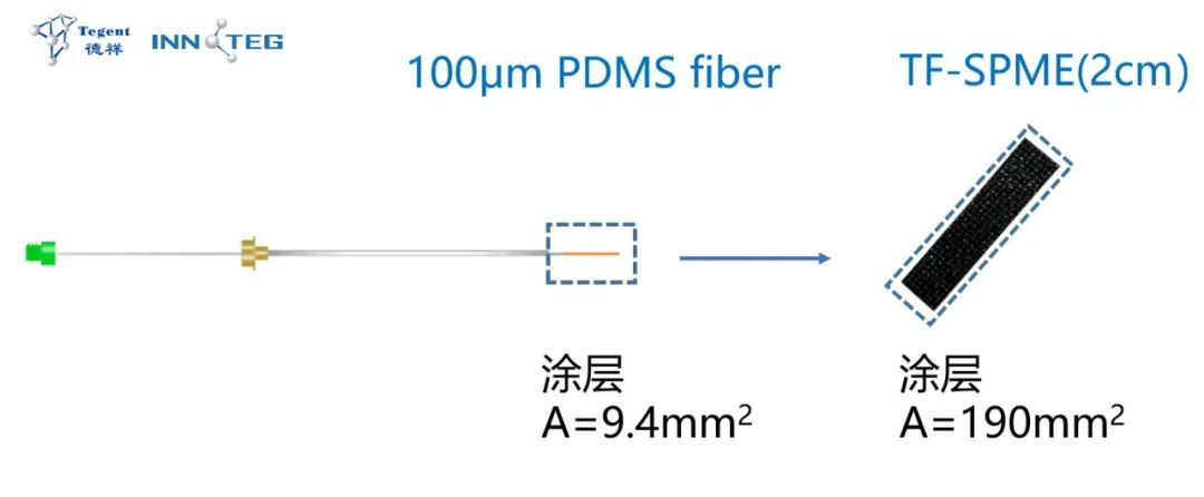 為了解決SPME fiber有限的吸附容量和萃取速率而開發(fā)了TF-SPME技術(shù),TF-SPME通過大大提高了其涂層的表面積/體積比(Surface-volume vadio),不僅增加吸附容量,一定的預(yù)平衡時間內(nèi)具有更優(yōu)秀的靈敏度。同樣為PDMS涂層,TF-SPME薄膜的表面積比100um SPME fiber的表面積增加了20倍。