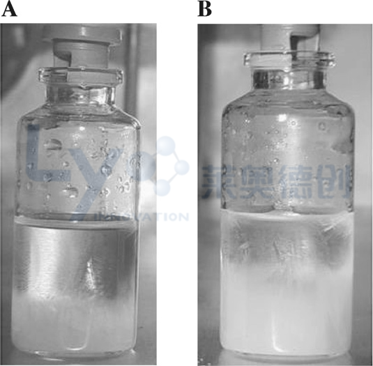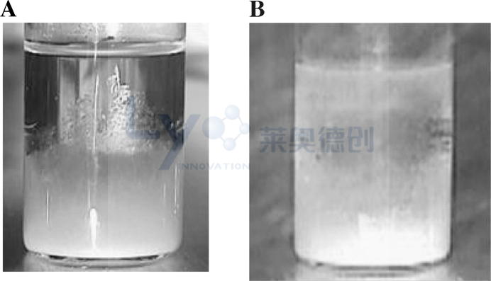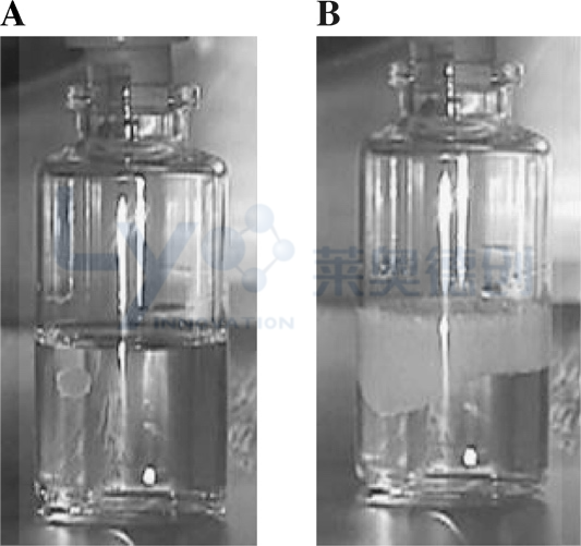 圖3:單步冷凍工藝的SBECD+5%TBA的冷凍行為照片A:冰晶脫離并浮起;照片B:快速自上而下凍結(jié)