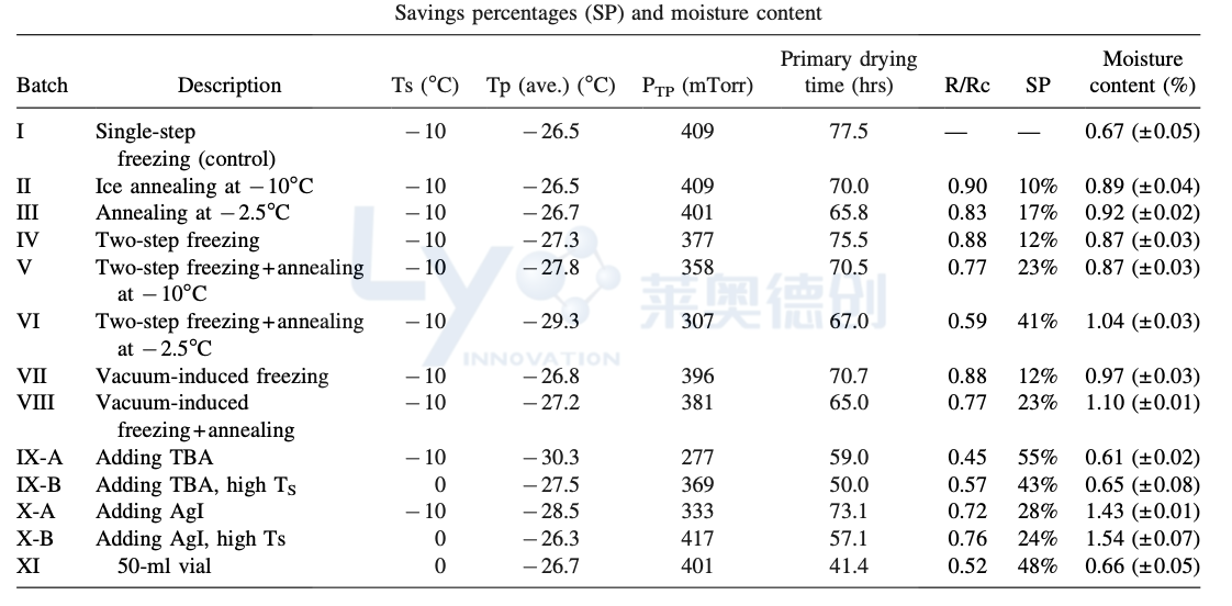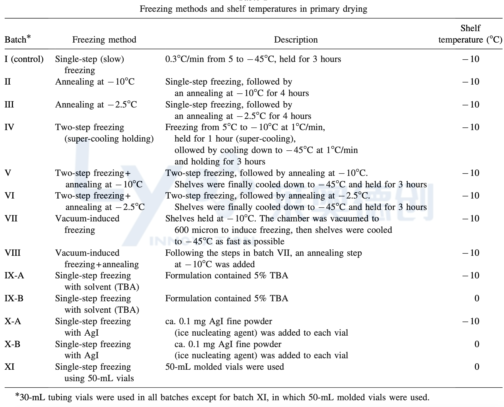 在對照批次(批次I)中,使用了藥品冷凍干燥生產(chǎn)中典型的冷凍工藝:[5]以0.3°C/min的速度將擱板溫度從5°C降至-45°C,并保持3小時(shí),以確保所有小瓶中的產(chǎn)品完全冷凍和固化。