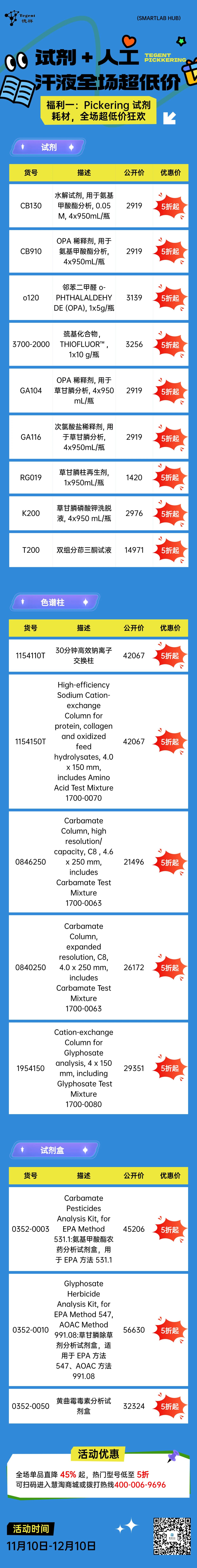 做色譜分析、離子檢測,靠譜試劑是實驗成功的關鍵!Pickering 全系試劑耗材,從柱后衍生試劑到離子色譜專用耗材,不僅純度在線、適配性強,這次價格更是直接 “腰斬” 級優(yōu)惠: