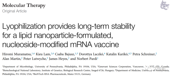 賓夕法尼亞大學(xué)與德國BioNTech學(xué)者共同在Molecular Therapy發(fā)表過一篇文章:Lyophilization provides long-term stability for a lipid nanoparticle-formulated, nucleoside-modified mRNA vaccine。