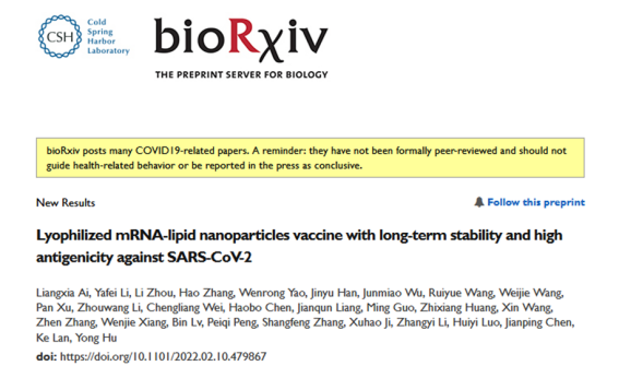 瑞科吉生物的凍干劑型mRNA-LNP新冠肺炎疫苗采用LNP遞送系統(tǒng),應(yīng)用自主開發(fā)的冷凍干燥技術(shù)實現(xiàn)了4℃和25℃條件下的制劑穩(wěn)定性。該疫苗可在常規(guī)冷鏈條件下貯存與運輸,很大地提高了疫苗的可及性。研究成果已在 bioRxiv 在線發(fā)布,題為Lyophilized mRNA-lipid nanoparticle vaccines with long-term stability and high antigenicity against SARS-CoV-2。