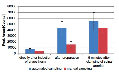 當(dāng)自動(dòng)取樣時(shí),峰面積要高得多。這些結(jié)果表明,自動(dòng)采樣,特別是在高呼吸頻率下,比人工采樣更有效。(如圖5所示)